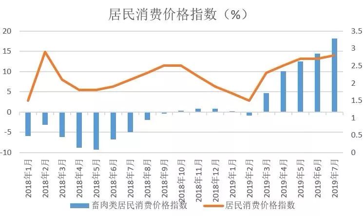 通过分析“肉类产品价格指数”以及整体“居民消费指数(CPI)”变化趋势,可以十分清晰的发现肉类价格波动对CPI影响巨大,整个CPI似乎是只是在反映肉类价格。另外根据我国居民的饮食习惯,这里的肉类绝大多数都是猪肉。也就是说“二师兄”身价的飞速上涨,推动了今年CPI连续五个月超过2%,7月甚至达到了2.8%。