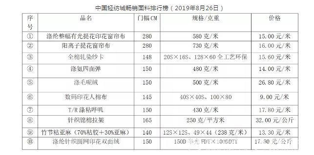 近期市场,除了涤纶整幅有光提花印花窗帘布、阳离子大提花窗帘布、全棉轧染纱卡依旧位居中国轻纺城畅销面料排行榜(2019年8月26日)前三位,涤氨四面弹、涤毛呢绒等秋冬面料营销逐渐活跃,成交量稍有上升。
